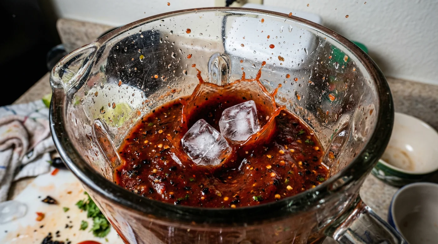 Primero, el calor emulsiona los diminutos rastros de aceites naturales presentes en las semillas del chile y el tomate con el agua vegetal, inyectando microburbujas de aire en la mezcla. Segundo, y más crítico, el calor destruye el licopeno. El licopeno es el pigmento natural que le da al tomate su color rojo encendido y es extremadamente sensible al estrés térmico prolongado y a la oxidación acelerada. Aquí es donde una solución contraintuitiva cambia todo: agregar un simple cubo de hielo al vaso antes de licuar. El hielo no aguará tu receta; actuará como un escudo térmico protector.
