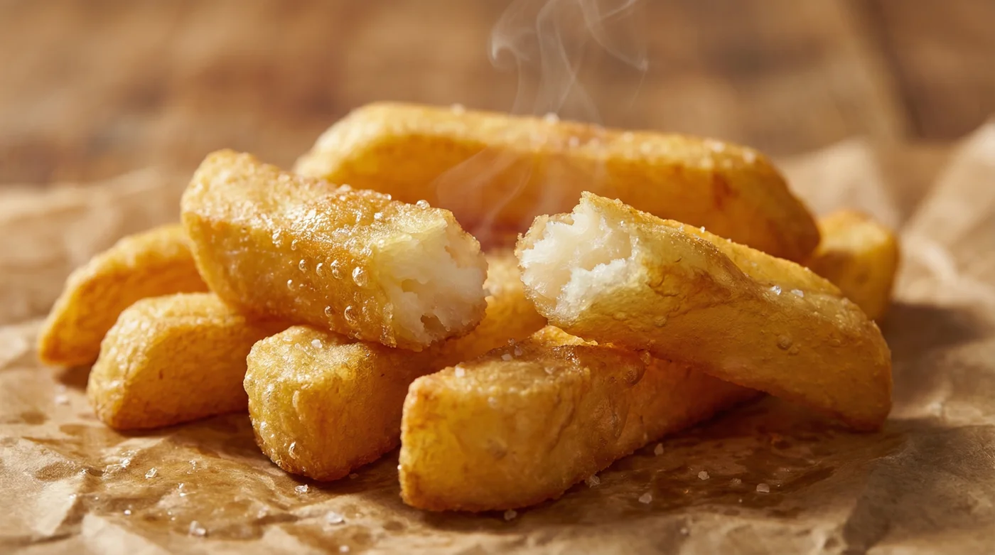 El resultado es una paradoja térmica que juega totalmente a tu favor. Obtienes un bastón que puede soportar el manejo rudo de las pinzas y el choque violento de la fritura profunda, revelando una resistencia física casi arquitectónica que envuelve un puré caliente y meloso.