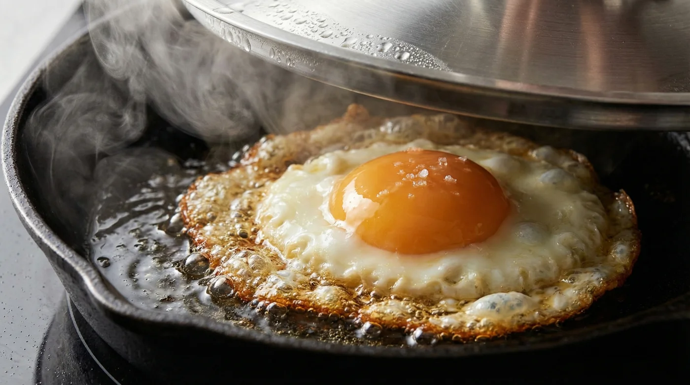 El cambio de perspectiva ocurre cuando dejas de ver el sartén como una plancha de fritura y comienzas a entenderlo como una cámara de microclima. Atrapar el vapor con una tapa semiabierta sella la clara perfectamente desde arriba, usando un calor húmedo y gentil, mientras el fondo cruje con el contacto directo del metal caliente. Es la diferencia entre asar una flor y dejar que se abra con el rocío de la mañana.
