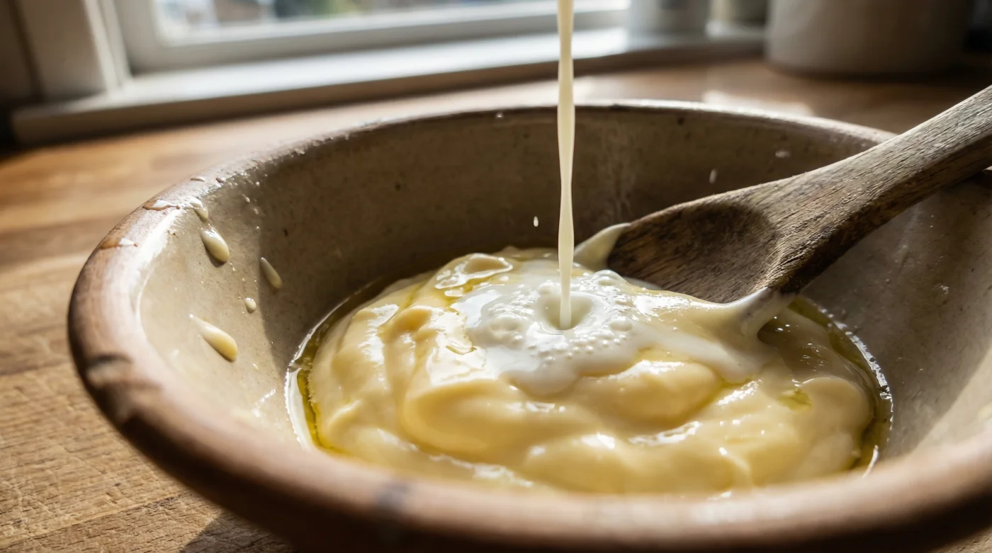 Aprendí cómo corregir esto hace varios años, observando en la pequeña cocina trasera de una fonda en la colonia Roma. El jefe de cocina, un hombre que picaba cilantro con la precisión de un relojero, sacó un bote de tres kilos de mayonesa económica. Pero no la sirvió directamente. Tomó un recipiente de acero y dejó caer un fino hilo de suero de leche sobre la pasta amarilla. Con movimientos circulares y lentos, envolvió la mezcla. Al probar el aderezo final sobre unas papas cocidas, el sabor metálico y pesado había desaparecido. Lo que quedó fue una seda cremosa, pálida y brillante, con una acidez redonda que jurarías había sido hecha a mano esa misma madrugada.