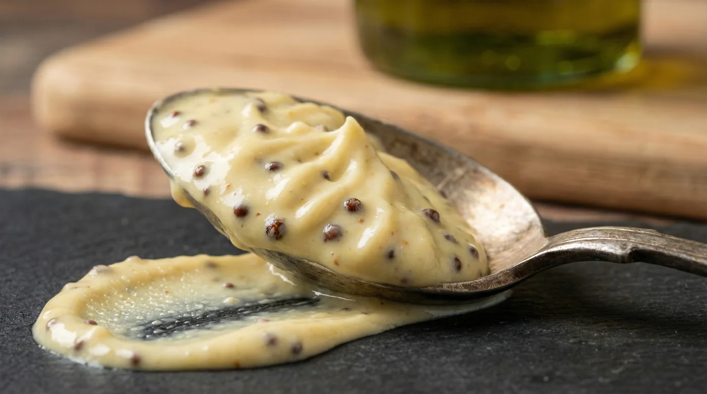 La semilla de mostaza cruda contiene en su interior mucílagos naturales y proteínas muy específicas que actúan como pequeños ganchos invisibles en medio del torbellino. Toman una molécula resbaladiza de aceite en una mano y una molécula ácida de vinagre en la otra. El resultado visual y táctil es una salsa deliciosamente opaca que tiembla suavemente en la cuchara, con toda la firmeza untuosa de la mayonesa, pero sin la necesidad de lidiar con los riesgos del huevo crudo.